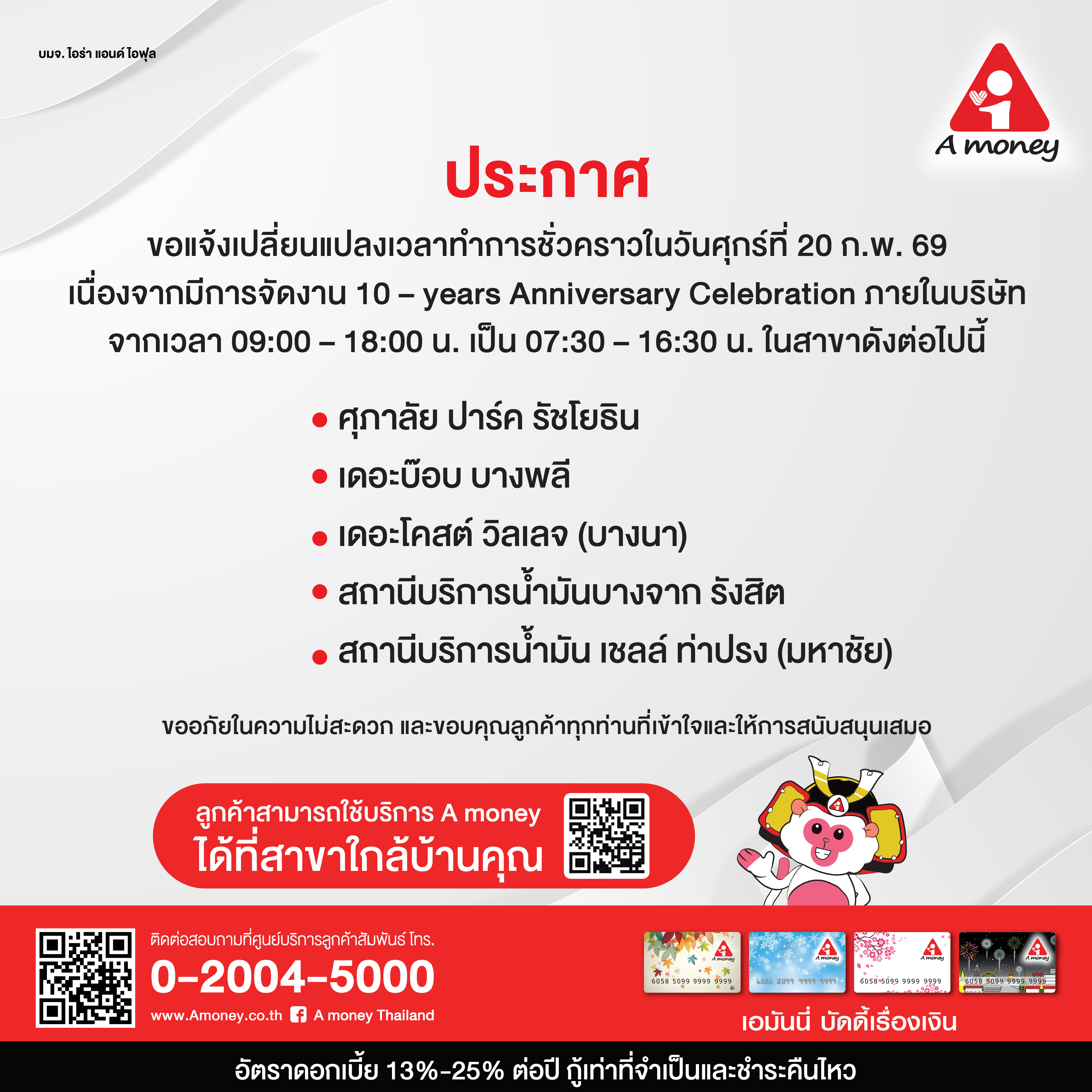 แจ้งเปลี่ยนแปลงเวลาทำการชั่วคราวในวันศุกร์ที่ 20 ก.พ. 69