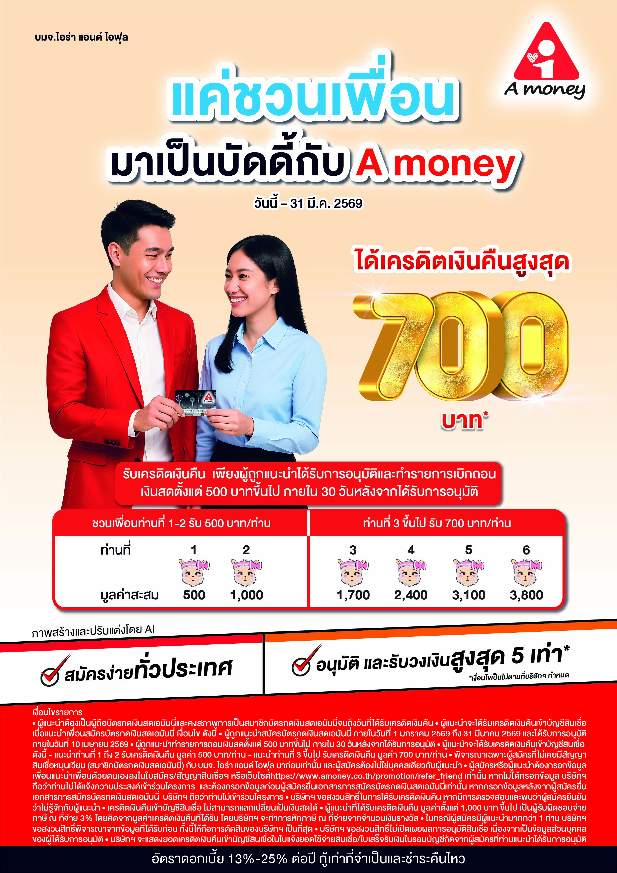 ชวนเพื่อนสมัคร A money วันนี้ อนุมัติแล้วรับเครดิตเงินคืนสูงสุด 700 บาท ตั้งแต่ 1 ม.ค. - 31 มี.ค. 2569