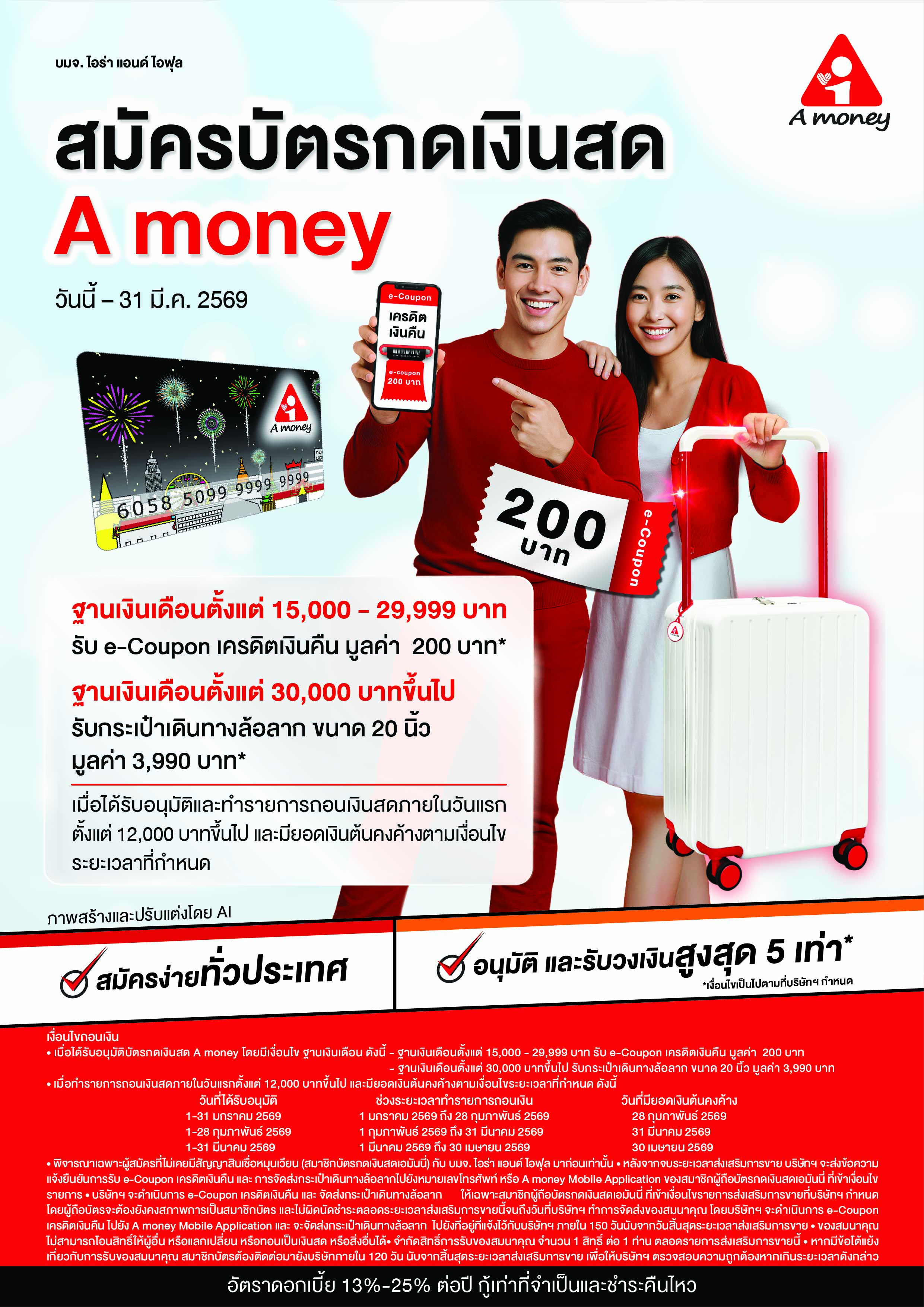 สมัครบัตรกดเงินสด A money วันนี้ตามเงื่อนไข รับของขวัญสุดพิเศษ ตั้งแต่ 1 ม.ค. - 31 มี.ค. 2569